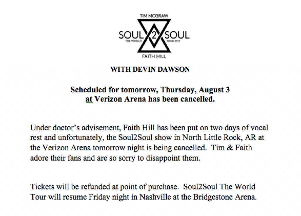 Tim McGraw and Faith Hill were forced to cancel their Soul2Soul Tour stop at the Verizon Arena in North Little Rock, Ark., on August 3.