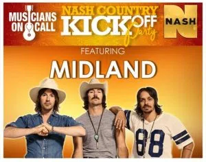 Reigning ACM New Vocal Group of the Year Midland—and their Grammy-nominated “Drinkin’ Poblem”—will headline the Kick-Off Party, with special guests Radio Romance, Abby Anderson and Brown & Gray.